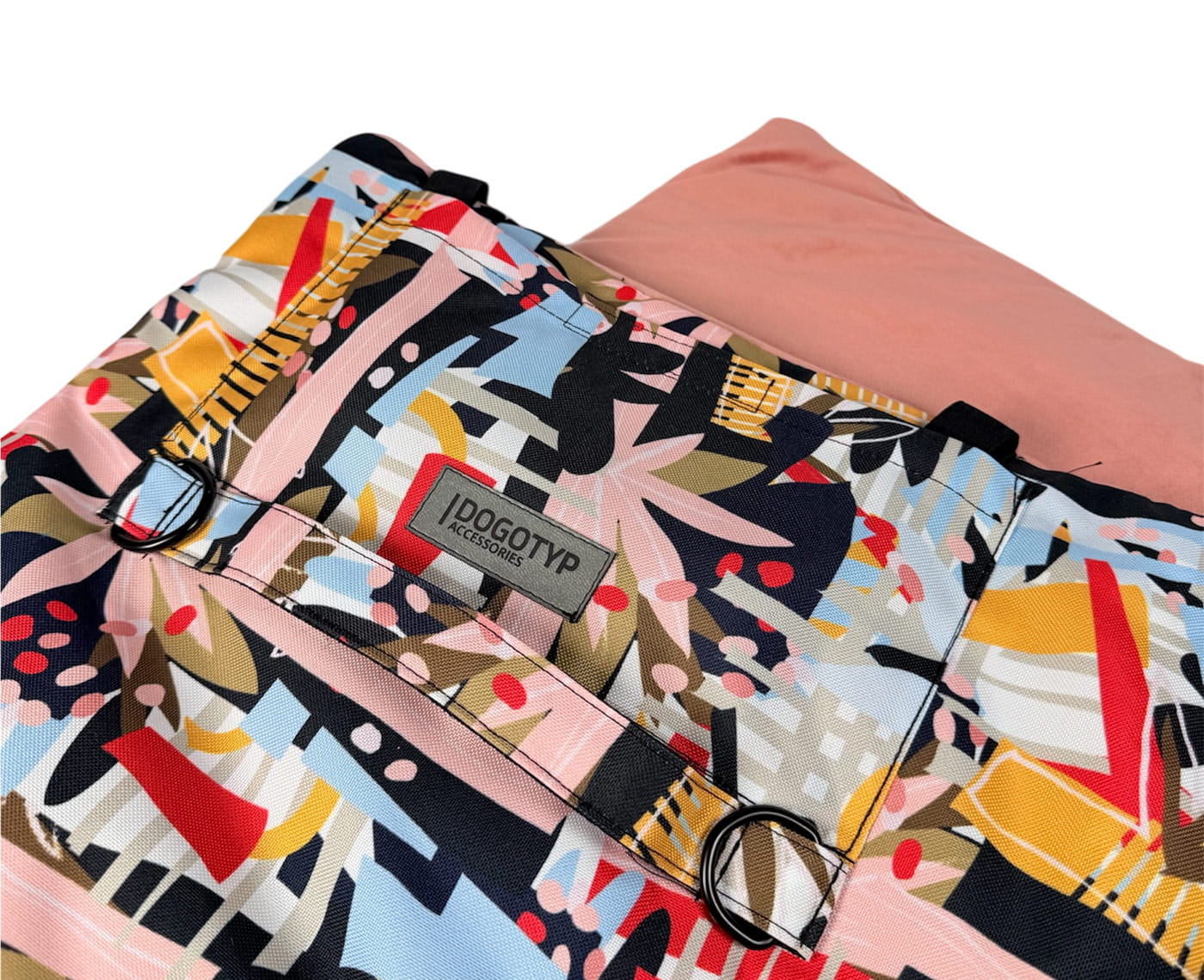 Produkt wykonano z trzech warstw materiału: wodoodpornego poliestru, wodoodpornego weluru oraz izolującej warstwy wewnętrznej nadającej całości miękkość i sprężystość. Struktura tkanin jest gładka i odporna na wbijanie się sierści, dzięki czemu czyszczenie powierzchni jest szybkie i łatwe — wystarczy rolka do ubrań lub wilgotna ściereczka. Materiał posiada właściwości hydrofobowe: rozlana woda pozostaje na powierzchni w postaci kropli, które można łatwo usunąć. Certyfikowana tkanina wykazuje zwiększoną odporność na zadrapania i zaciągnięcia od psich pazurów. Aby zapewnić maksymalną funkcjonalność w terenie, legowisko wyposażono w: